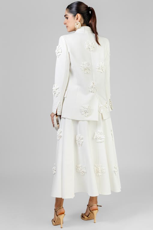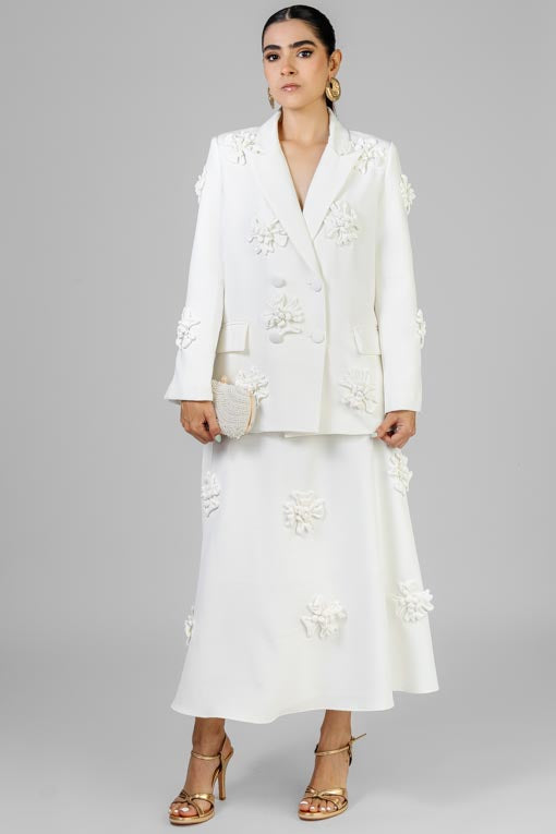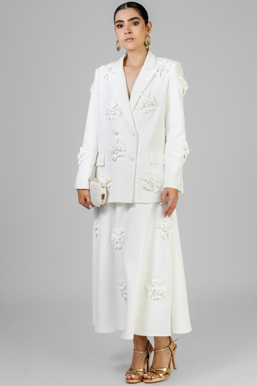 Conjunto saco cuello y solapa, botones al frente, manga larga, detalle de flores en 3d, falda cierre al costado, corte bajo recto
