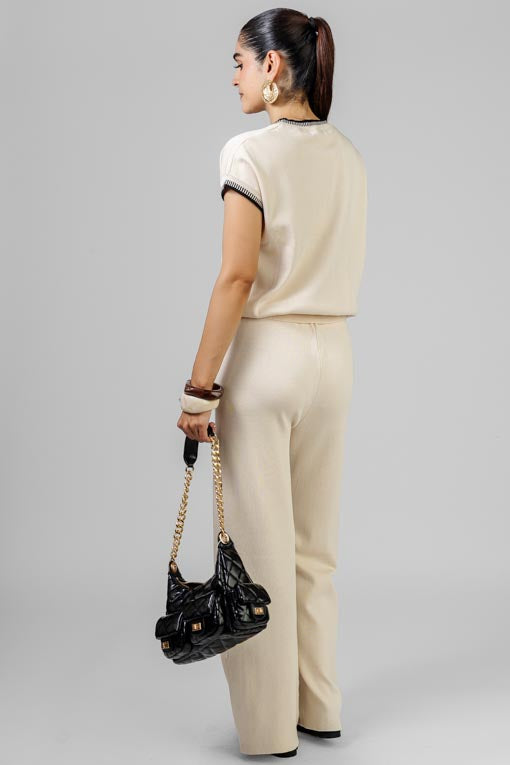 Conjunto tejido ligero, blusa escote redondo, manga pasada corta, pantalón cintura con elástico, corte bajo recto