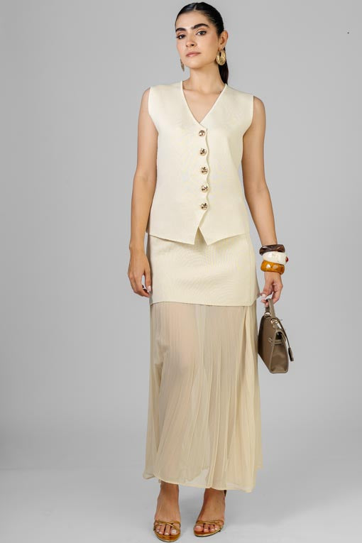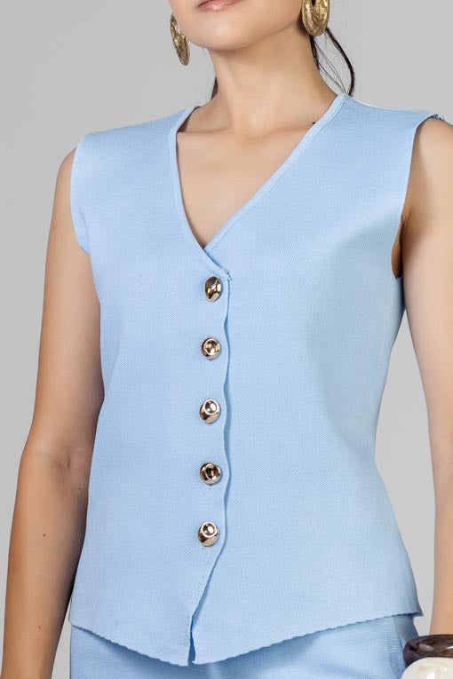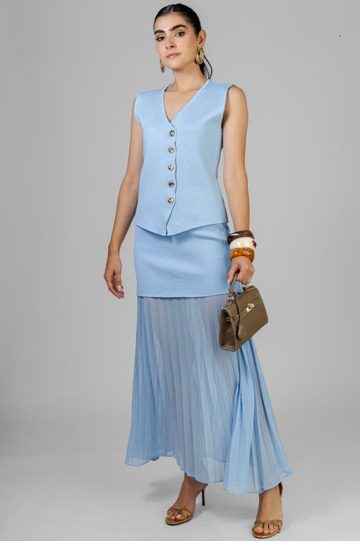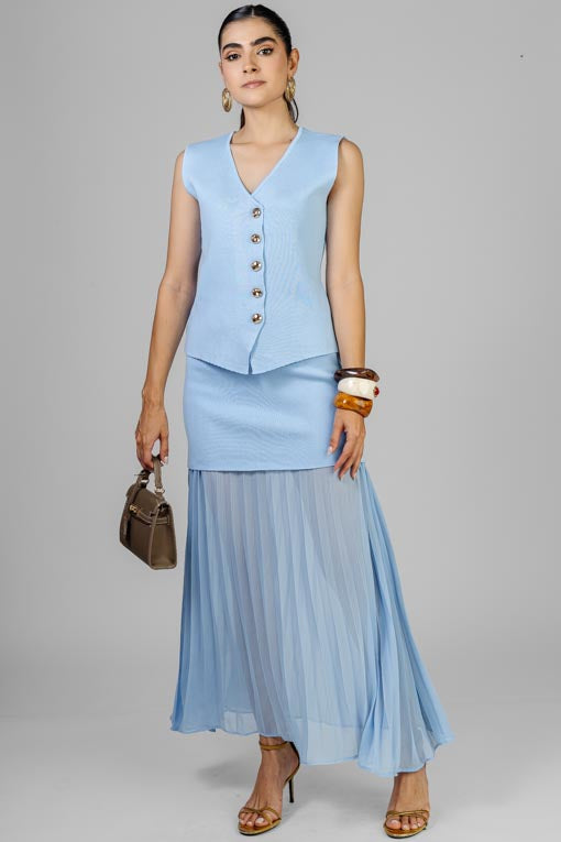 Conjunto blusa tejido ligero, botones al frente, falda elástico en cintura, peto tejido con falda plisada