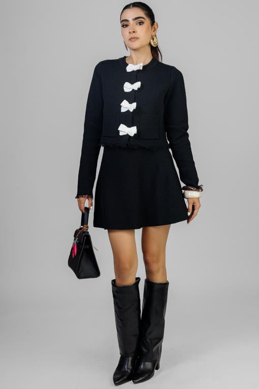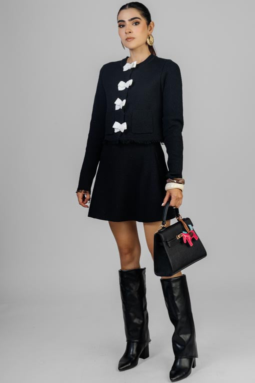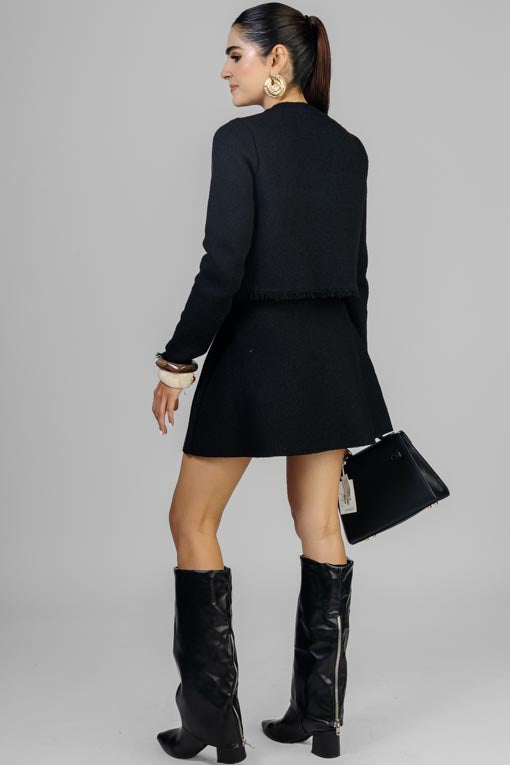 Conjunto tejido, chaqueta escote redondo, botones al frente, manga larga, falda corte tipo A, elástico en cintura