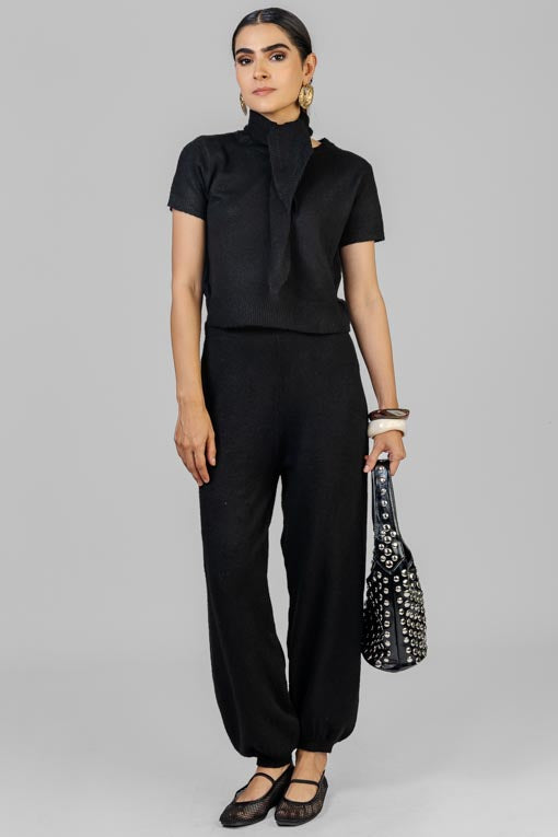 Conjunto tejido ligero, blusa cuello redondo, manga corta, pantalón cintura con elático, corte bajo con ajuste, detalle de pañoleta incluida