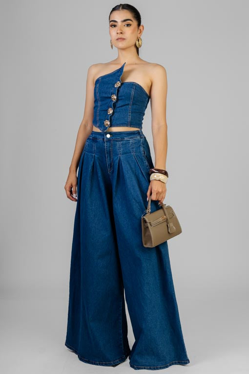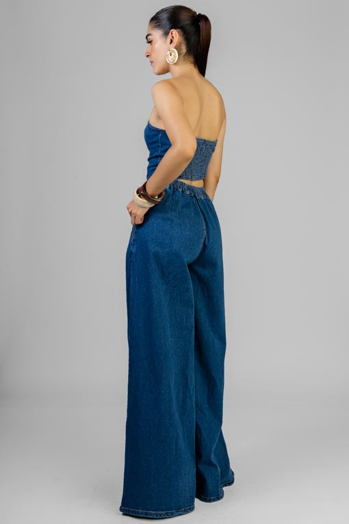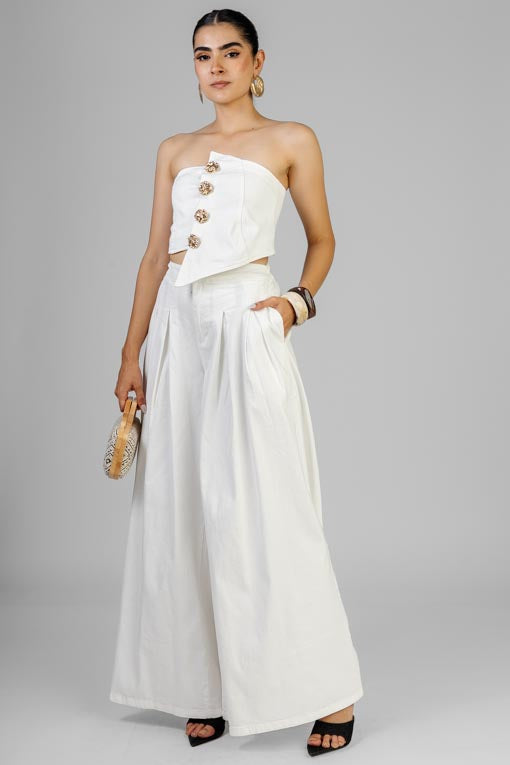 Conjunto top strapless, botones al frente, elástico por la espalda, pantalón cintura pretina elástico por la espalda, cierre y botón al frente, bolsas al costado, corte bajo recto