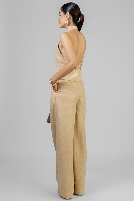 Conjunto blusa cuello halter, cierre al costado, elástico por la espalda, pantalón cierre y pinzas al frente, bolsas al costado, corte bajo recto