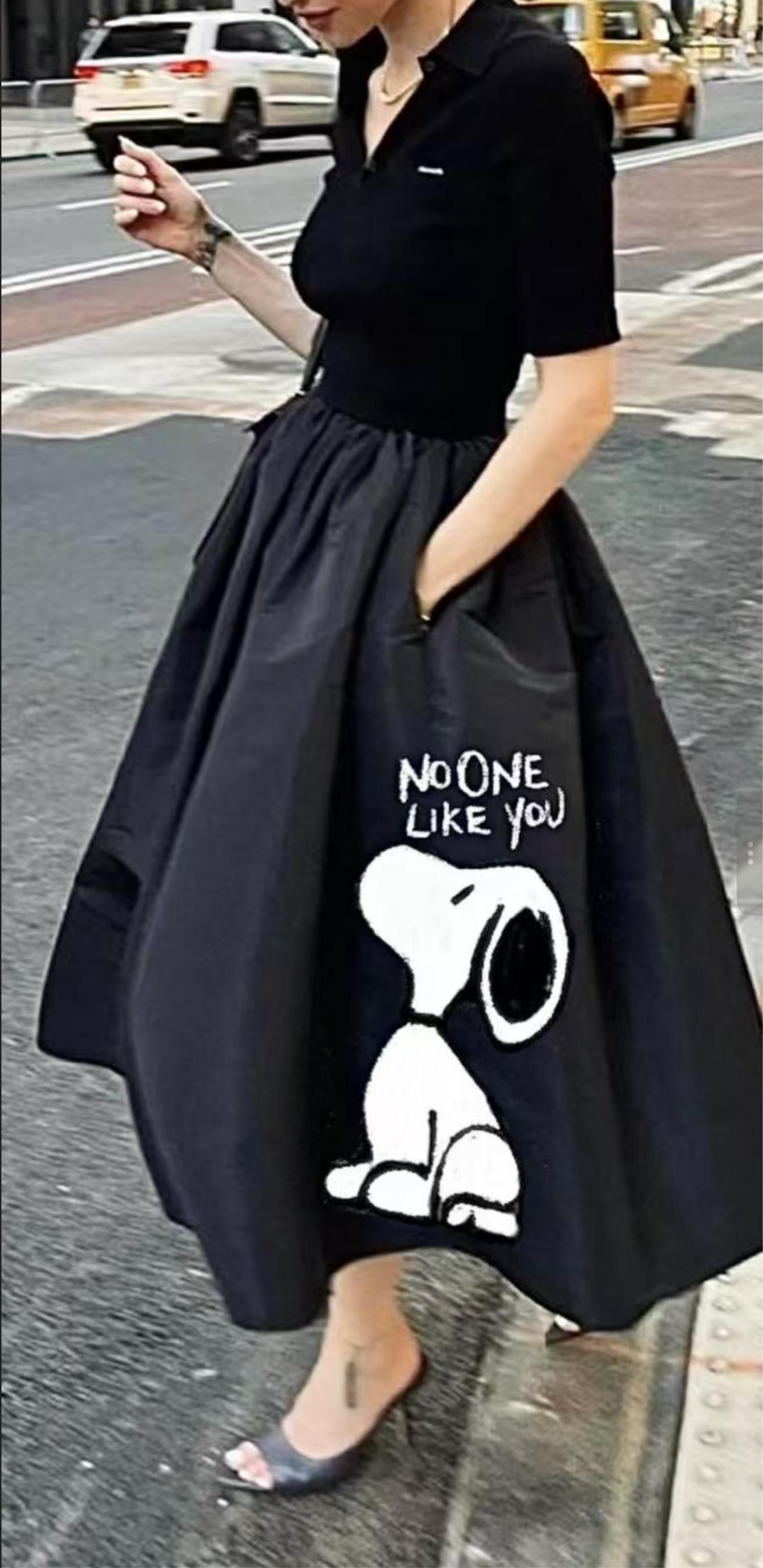 Conjunto falda midi estampada, blusa polo negro entallado, manga corta, falda negra con volumen, bolsillos y estampado. Elástico en cintura