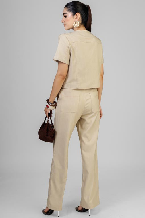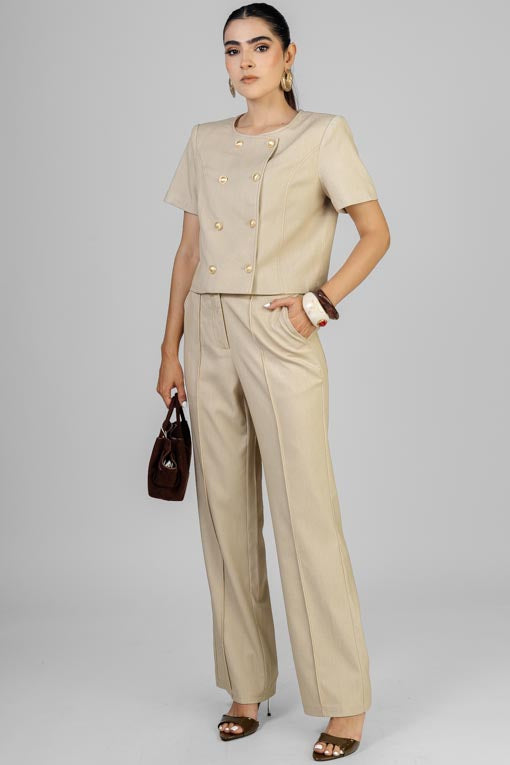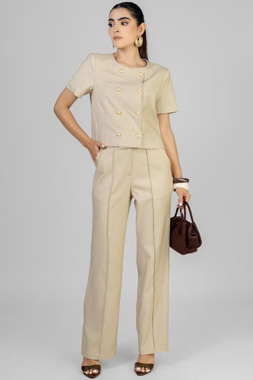 Conjunto sastre moddrno de dos piezas con botones dorados, escote redondo, botones cruzados, pantalón pretina lisa, cierre y botón al frente, bolsas laterales, corte bajo recto