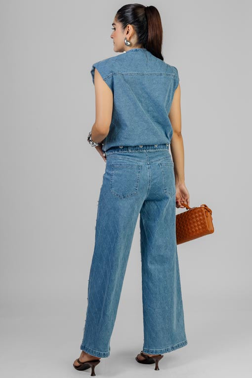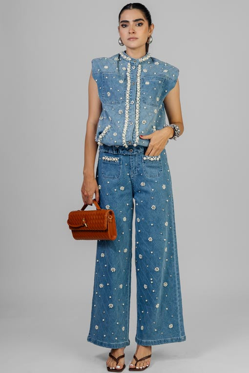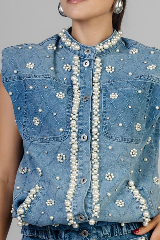Conjunto mezclilla, chaleco decorado con aplicaciones de perlas en forma de flores y borde realzado con perlas, botones al frente, corte bajo con elástico, pantalón tiro medio, cierre y botón al frente, decorado con perlas