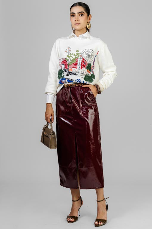 Falda corte recto, pretina lisa al frente y elástico en cintura, bolsas al costado, detalle de abertura al frente, corte bajo recto