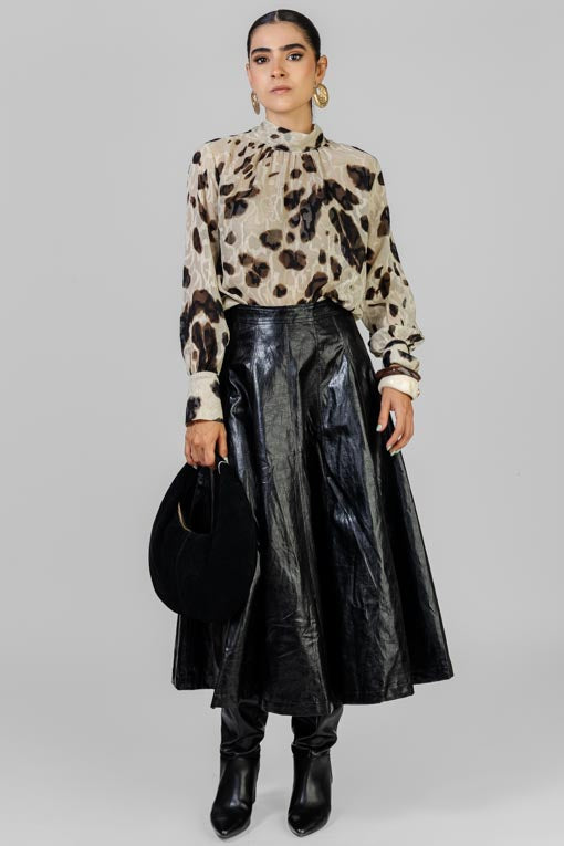 Falda vinipiel, cintura alta, cierre por la espalda, cortes con amplitud