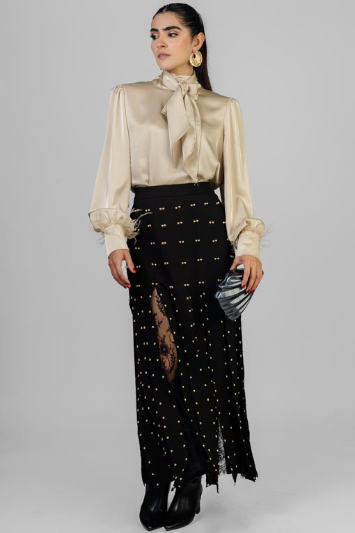 Falda pretina lisa al frente y elástico por la espalda, cierre al costado, detalle de estoperoles y tiras con fonde de encaje