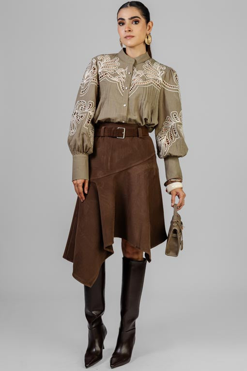Falda cintura alta, cierre al costado, elástico por la espalda, cinto incluido, corte bajo asimétrico