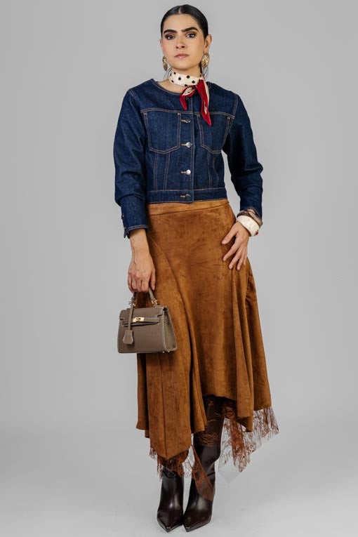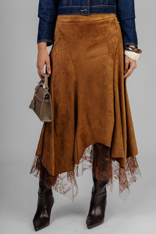 Falda gamuza, pretina lisa con cierre al costado, cortes en cuchilla con amplitud, corte bajo con detalle de encaje