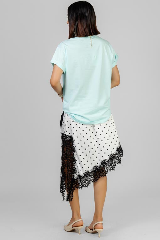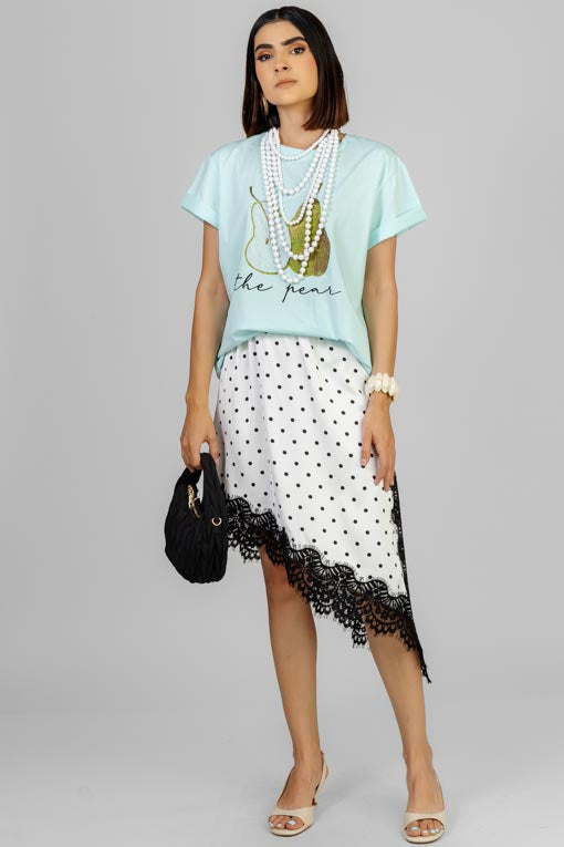 Falda de silueta fluida con pretina elástica que aporta comodidad y ajuste relajado. El diseño destaca por su estampado de lunares, que le da un aire clásico y femenino, mientras que el corte asimétrico en el bajo añade dinamismo y movimiento.