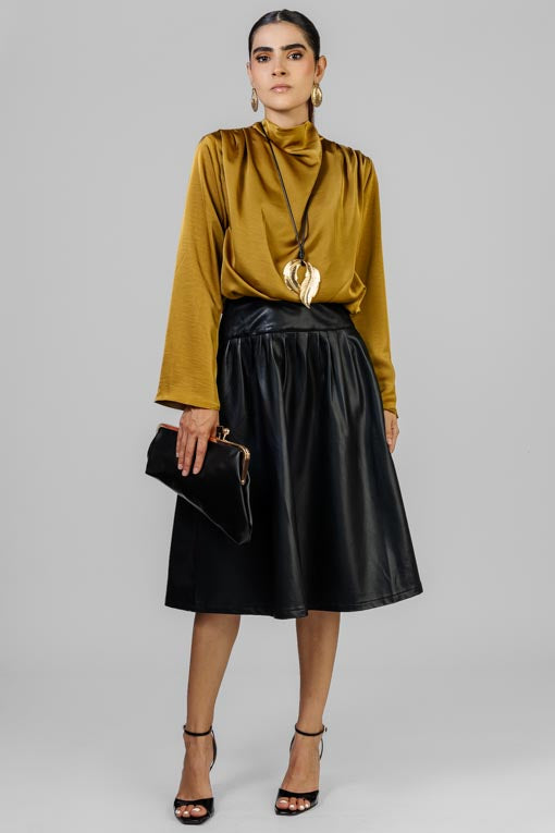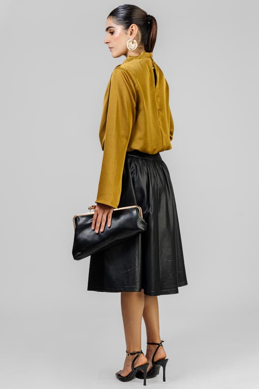 Falda vinipiel con pastelones, cierre por la espalda, peto que ajusta la silueta, corte bajo recto