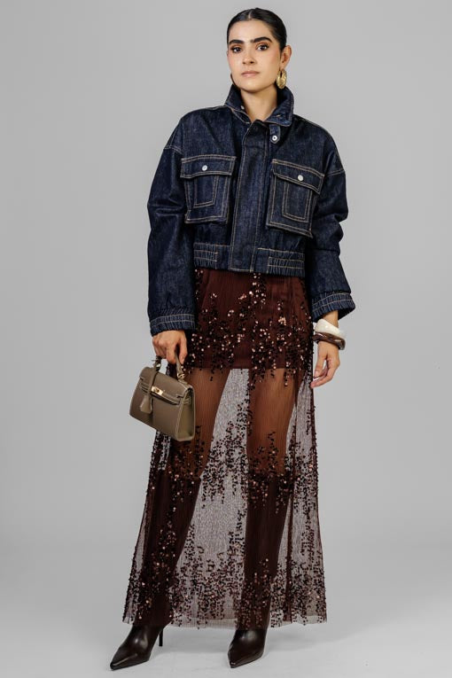Falda cintura con elástico, detalle de lentejuelas, corte bajo recto