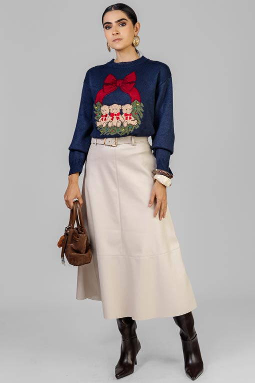 Falda vinipiel pretina lisa, cierre por la espalda, corte en linea A, cinto incluido