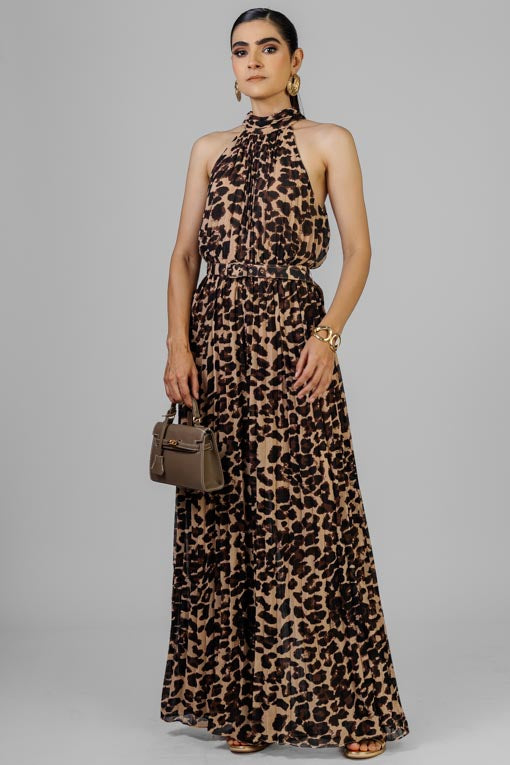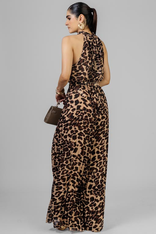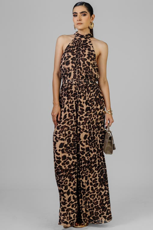 Palazzo cuello alto con lazo ajustable por la espalda, corte en cintura con elástico, cinto incluido, corte bajo recto