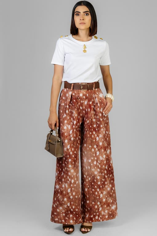 Pantalón confeccionado en tela ligera de caída suave que crea movimiento al caminar. Presenta tiro alto con pliegues frontales, lo que estiliza la cintura y aporta una silueta sofisticada. Su pierna amplia tipo palazzo brinda comodidad un look muy chic. Cintura con elástico por la espalda, bolsas al costado, cinto incluido