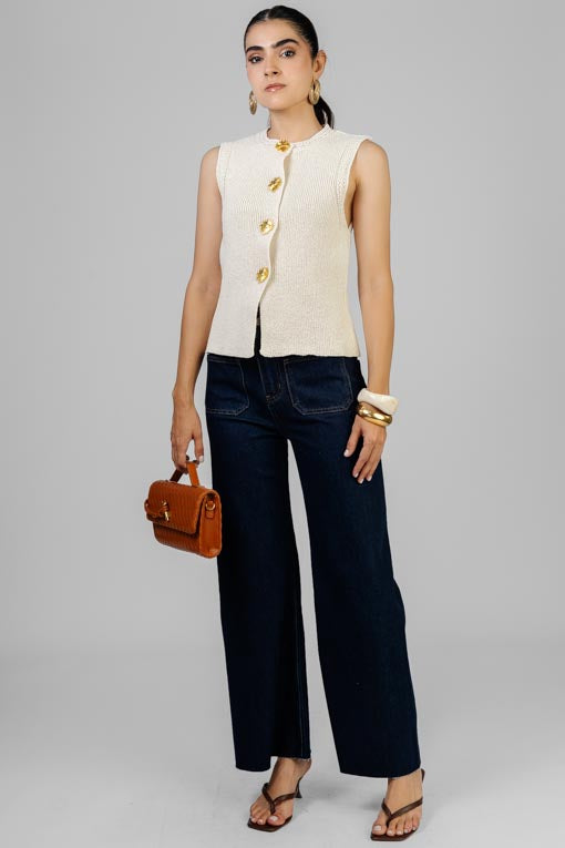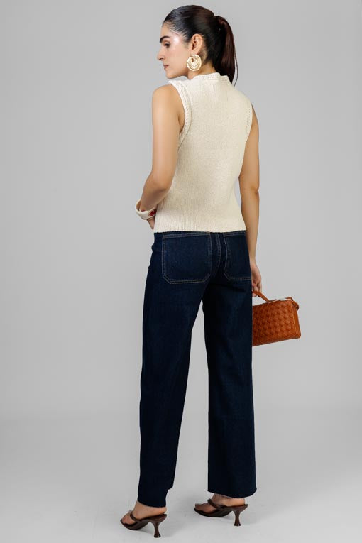 Pantalón cintura alta, cierre y botón al frente, corte bajo recto