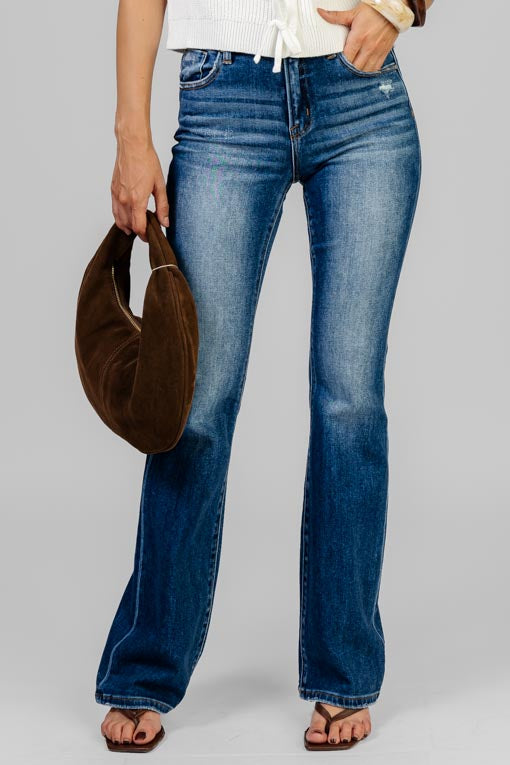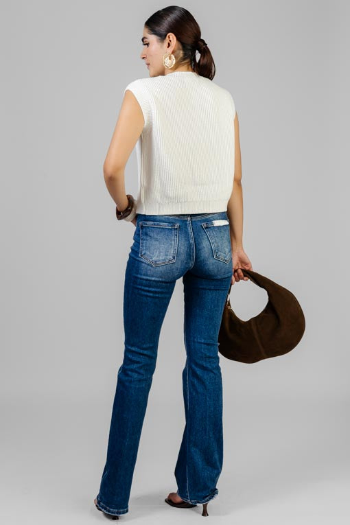 Pantalón mezclilla, cierre y botón al frente, bolsas al costado, corte bota ancha