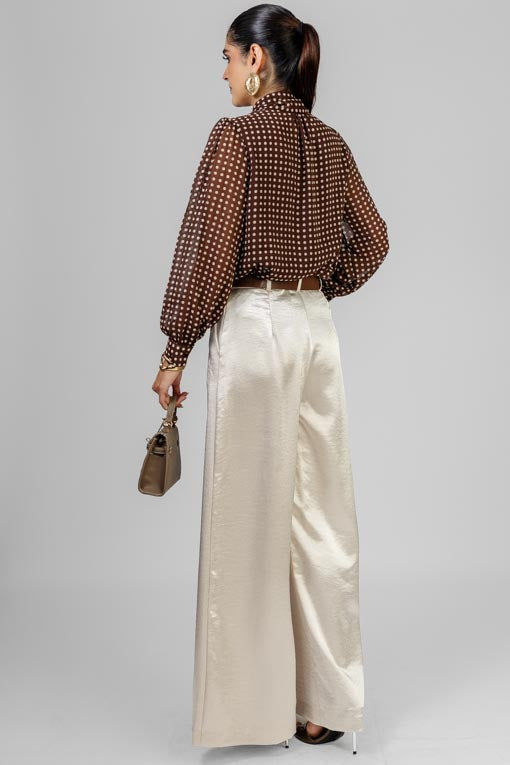 Pantalón de tiro alto, confeccionado en tela satinada con acabado liso y caída fluida. Pierna amplia que estiliza, Incluye cinturón para un ajuste en cintura y detalle frontal limpio, pretina lisa, cierere y botón al frente, corte bajo recto
