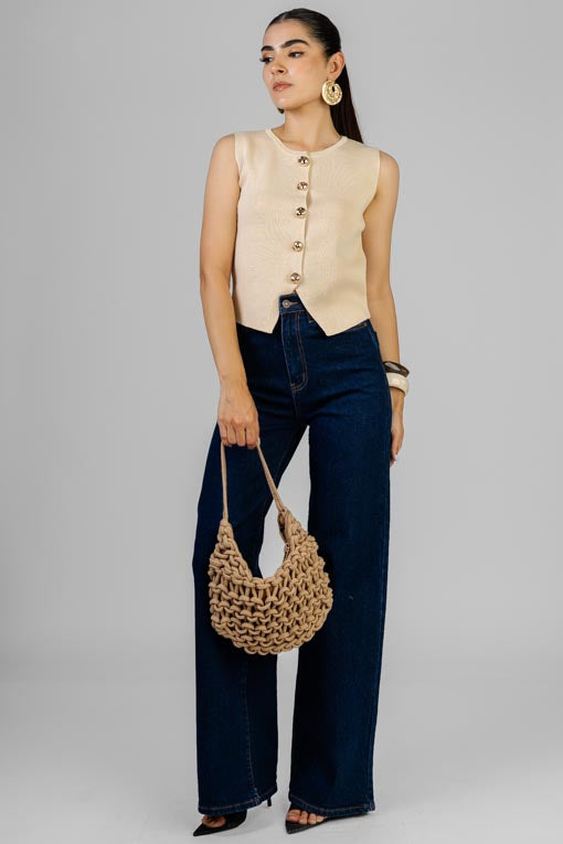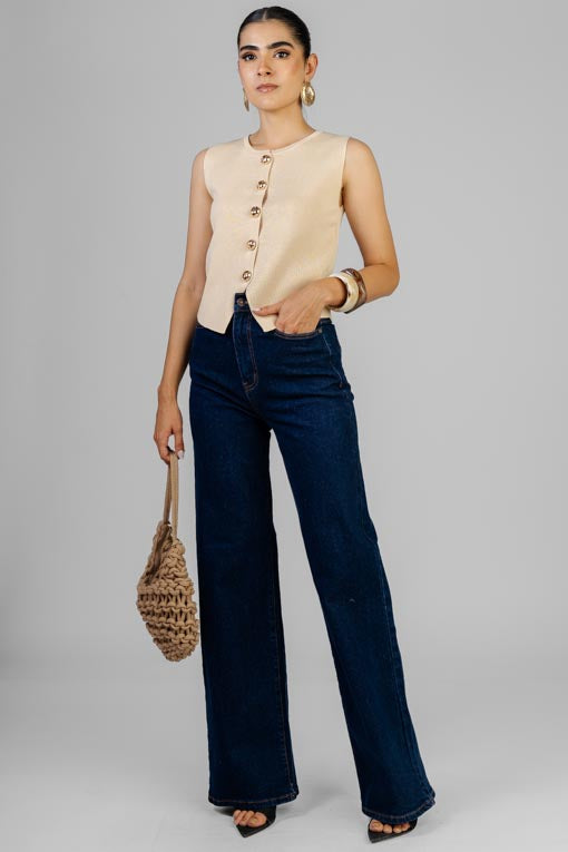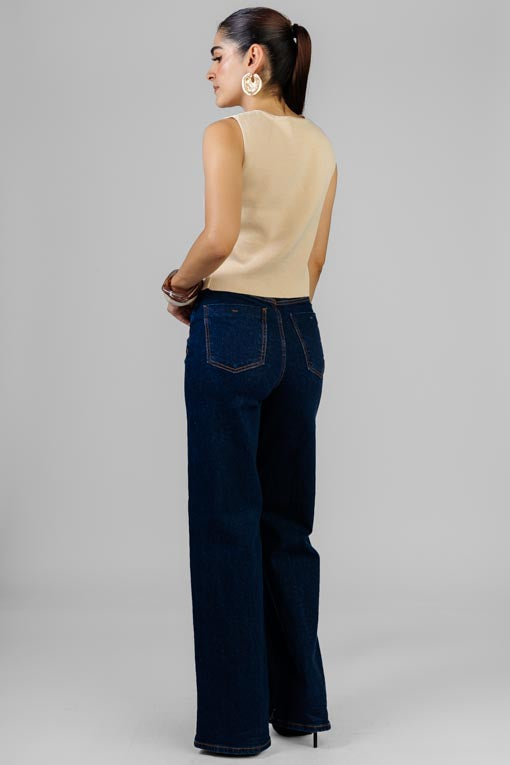 Pantalón mezclilla, cintura alta, cierre y botón al frente, corte recto