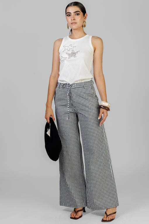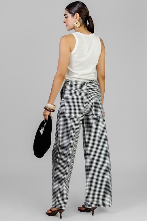 Pantalón cintura alta, cierre y botón al frnete, bolsas laterales, cort bajo recto