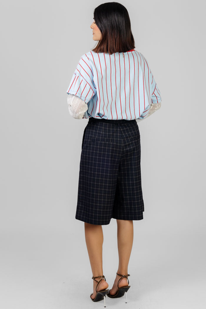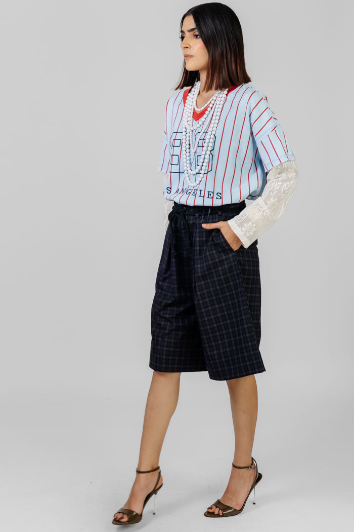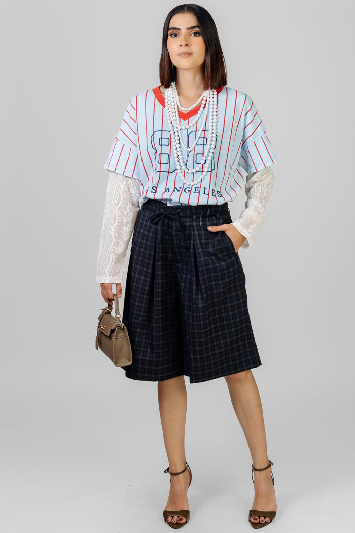 Playera de corte relajado con vibra sporty-urbana. Presenta cuello en V con contraste que enmarca el rostro y mangas amplias para mayor comodidad. El diseño de líneas verticales estiliza visualmente, mientras que el gráfico frontal tipo jersey con número y tipografía le da un aire dinámico y juvenil. Ideal para looks casuales con actirud, perfecta para combinar con denin o prendas más relajadas