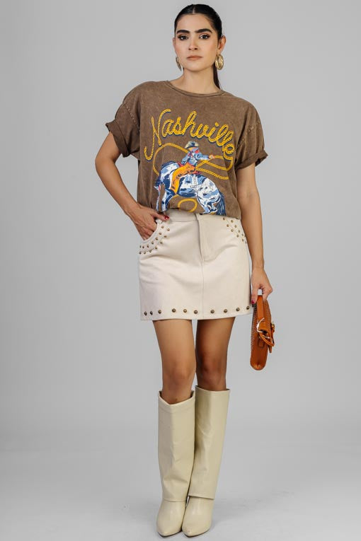 Playera corte oversize, escote redondo, manga corta, detalle de ilustración al frente, corte bajo recto