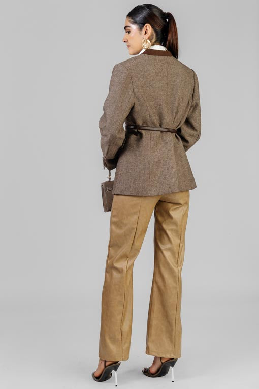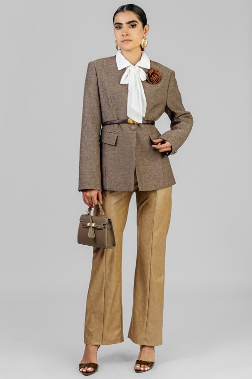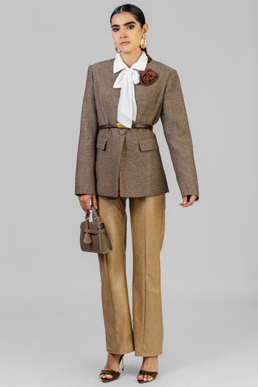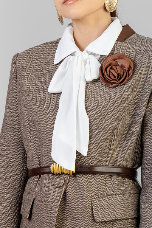 Saco cuello liso, botón al frente, detalle de broche, manga larga, corte bajo recto, cinto incluido