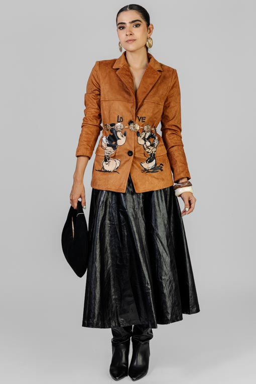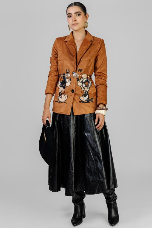 Saco cuello y solapa, manga larga, detalle de ilsutración al frente, corte bajo recto