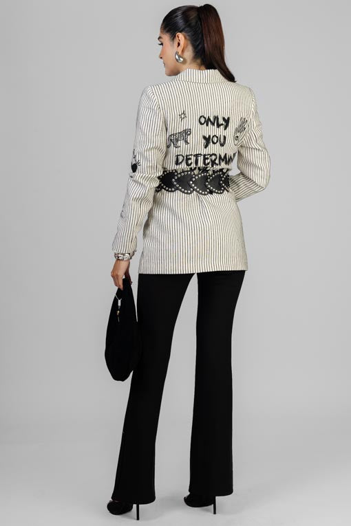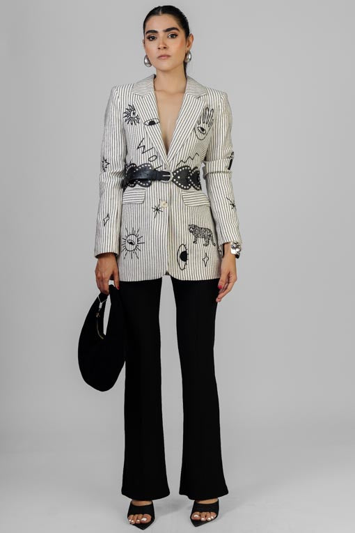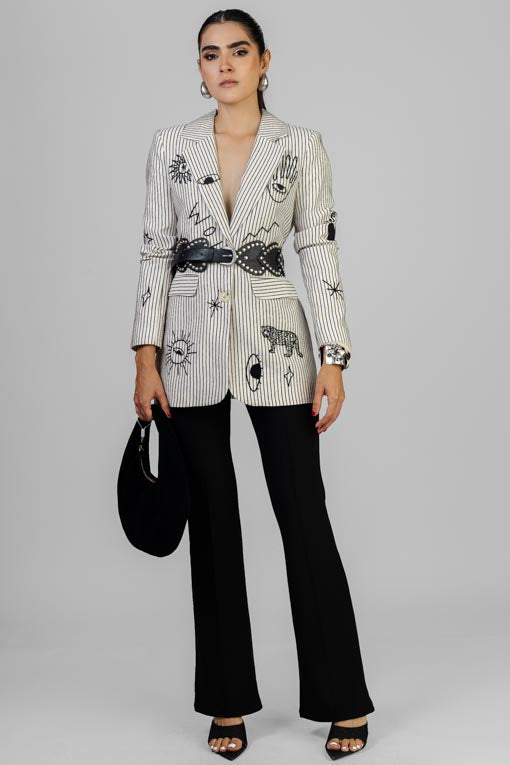 Saco cuello y solapa, botones al frente, detalle de bordados, corte bajo recto