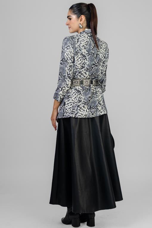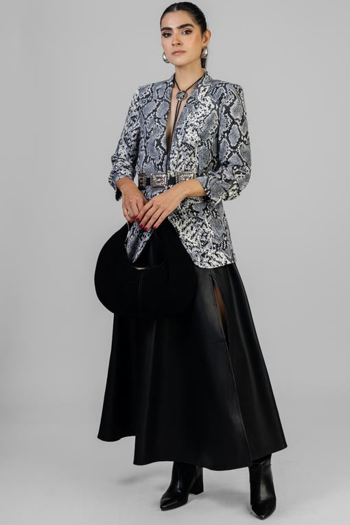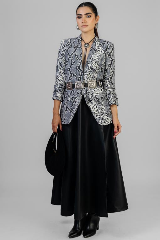 Saco cuello plano, manga larga con pliegues, bolsillos falsos al frente, corte bajo recto