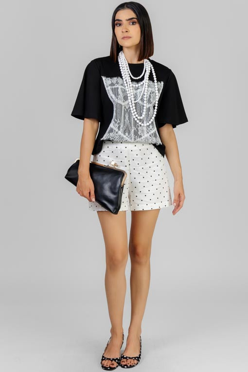 Short de tiro medio con siueta fluida y caída ligera que brinda movimiento y frescura. Diseño con estmapado de lunares que aporta un toque clásico y atemporal, ideal para looks casuales con blusas ligeras o tops ajustados