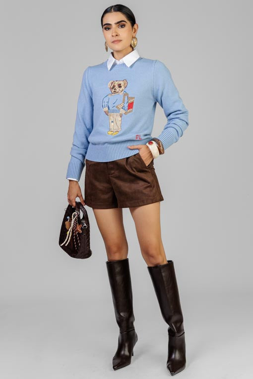 Short gamuza con pretina lisa, cierre y botón al frente, bolsas laterales, corte bajo recto