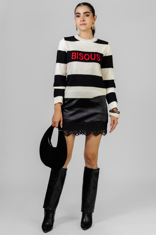 Suéter tejido, escote redondo, manga larga, detalle de bordados al frente, corte bajo recto
