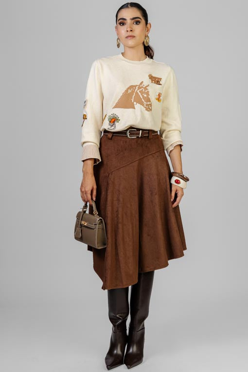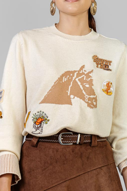 Suéter tejido ligero, escote redondo, manga larga, detalle de bordados