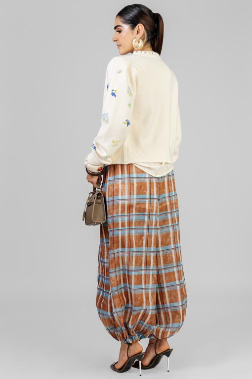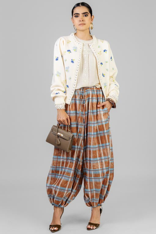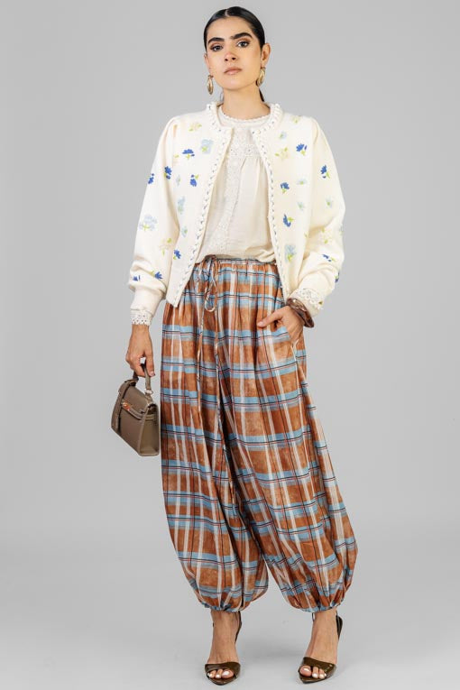 Suéter escote redondo, broches al frente, detalle de bordados, manga larga