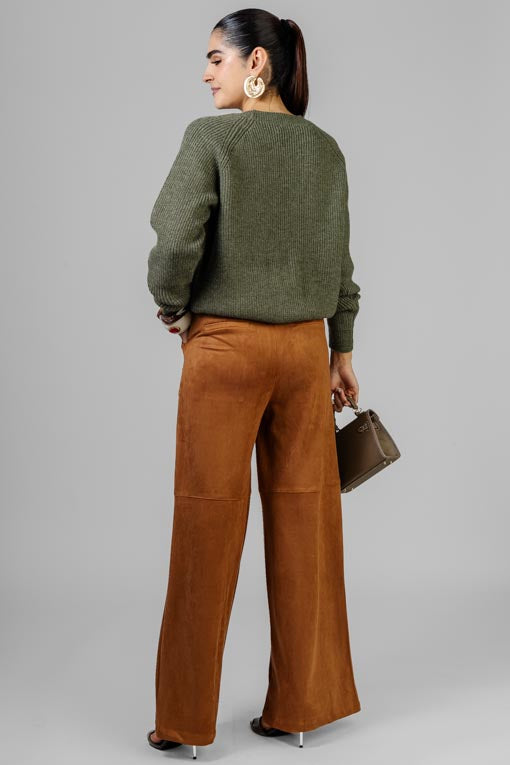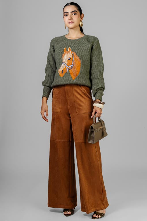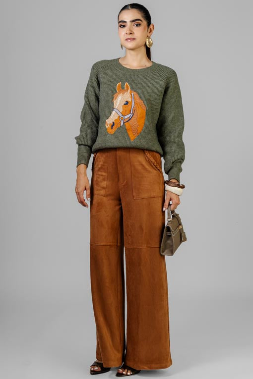 Suéter tejido escote redondo, manga larga, detalle de bordado al frente, corte bajo recto