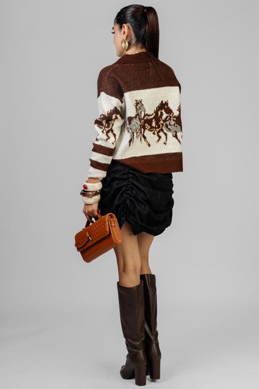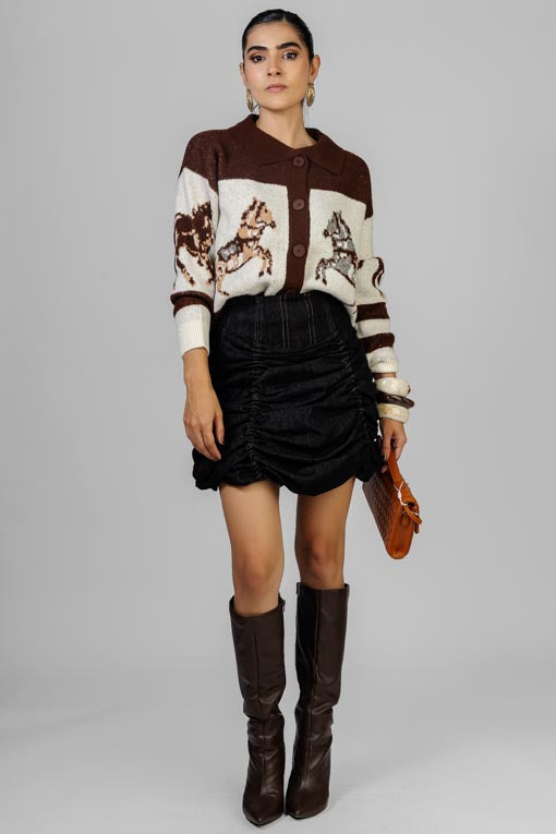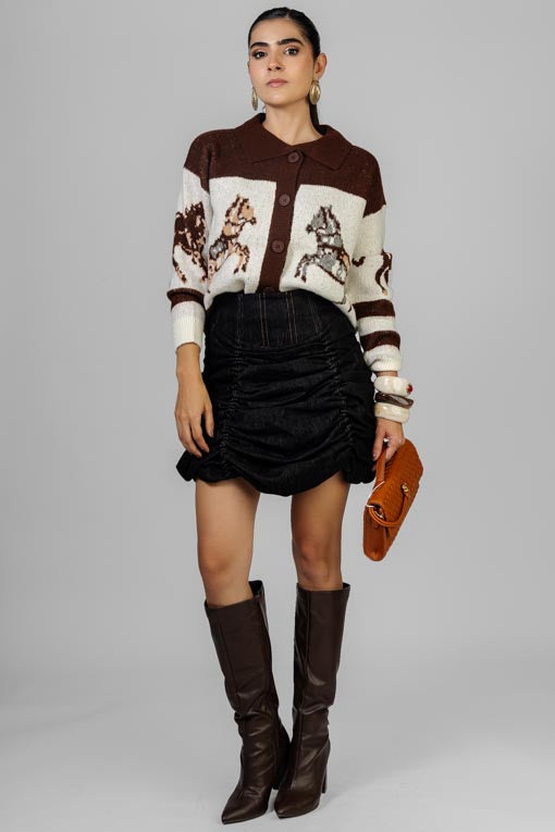 Suéter tejido, cuello, botones al frente, manga larga, detalle de ilustración