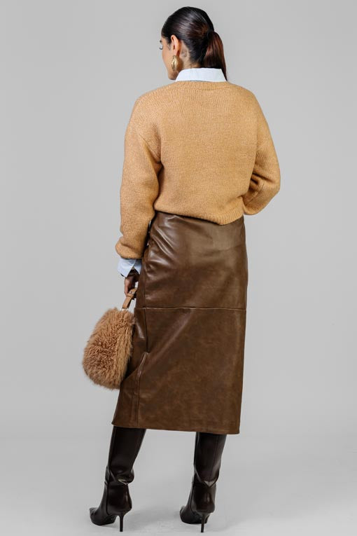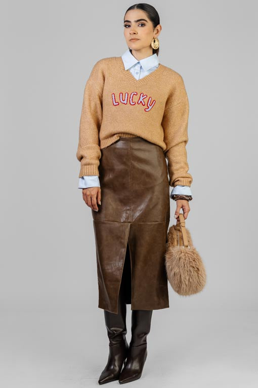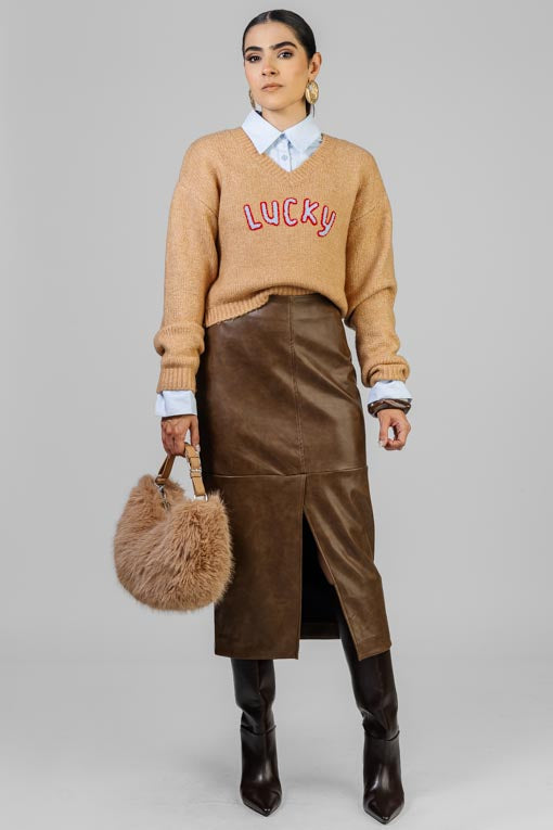 Suéter tejido suave, escote en V, detalle de ilsutración al frente