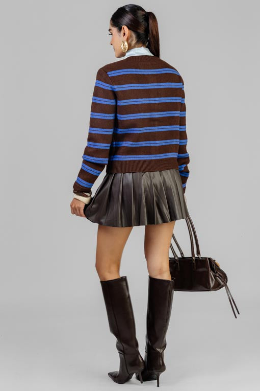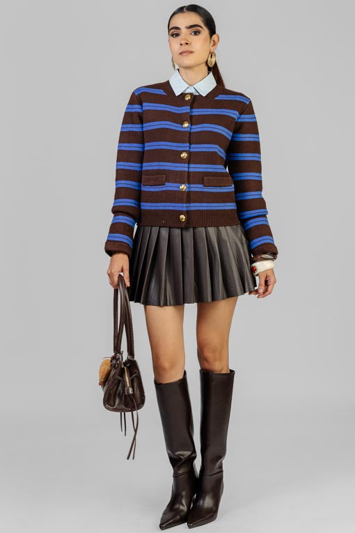 Suéter tejido grueso, escote redondo, botones al frente con detalle de bolsillos, corte bajo recto