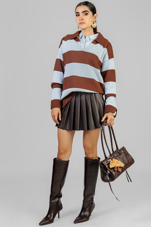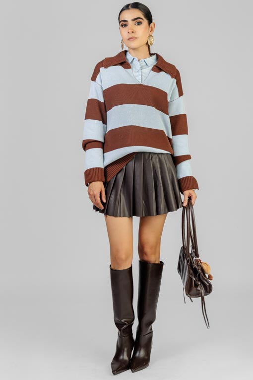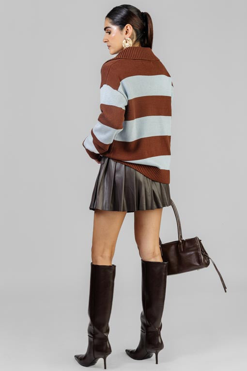 Suéter tejido grueso, cuello y aletilla, manga larga, corte bajo recto