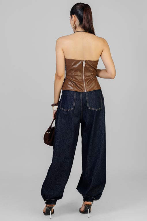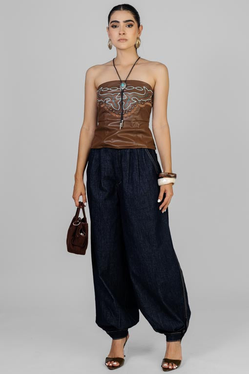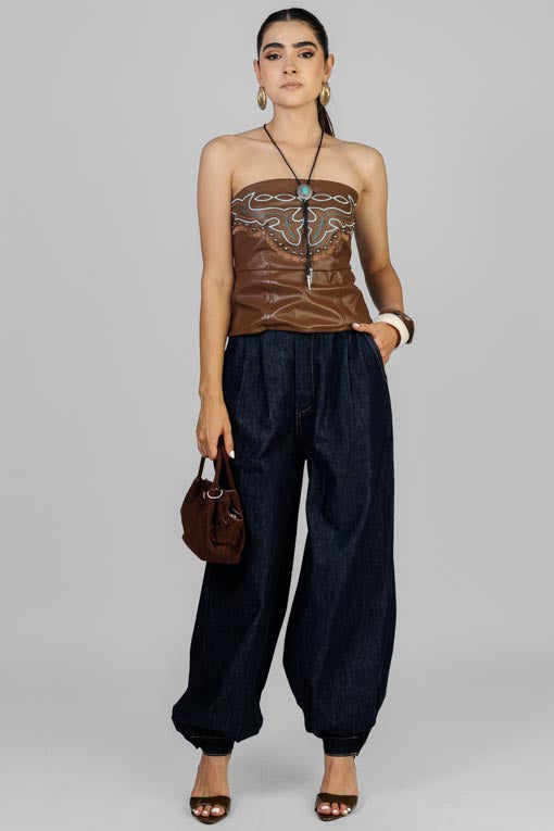Top escote recto, cierre por la espalda, detalle de bordados y estoperoles al frente, corte bajo recto