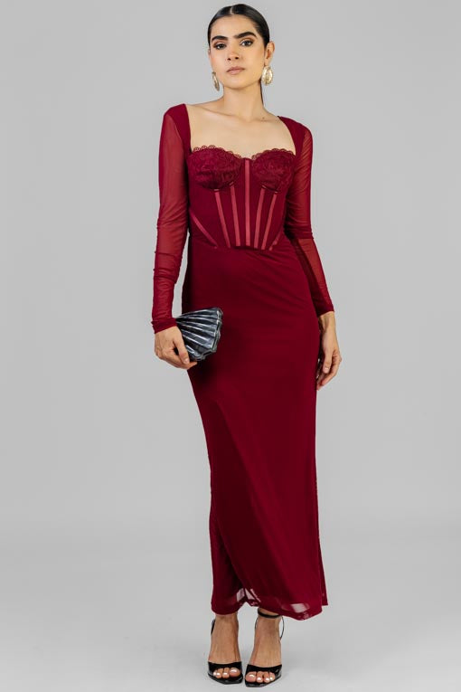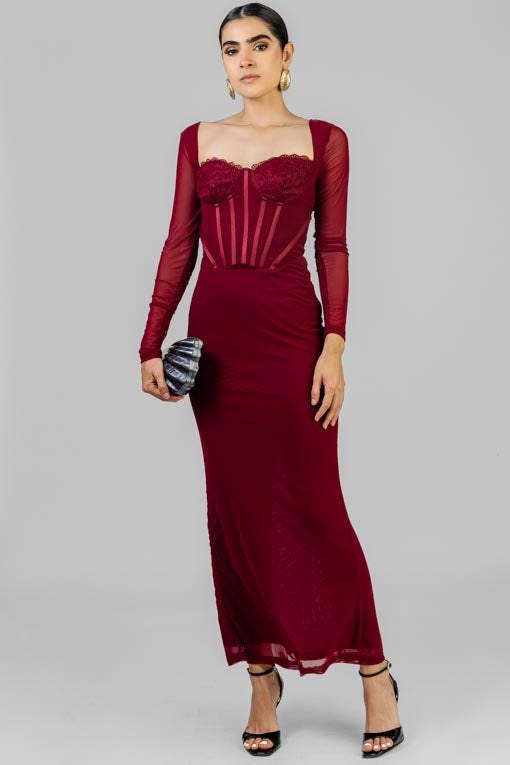 Vestido mesh manga larga, copas, cierre por la espalda, corte en cintura, falda recta abertura por la espalda