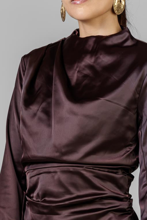 Vestido corto satinado de acabado sedoso y brillante, Su diseño corto con drapeado frontal estiliza la silueta, mientras que la manga larga añade un toque sofisticado ideal par anoches epeciales. El detalle fruncido lateral realza la gigura y aporta movimiento al look
