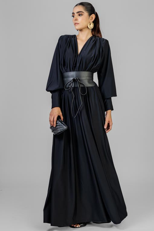Vestido escote pronunciado, manga larga, cinto incluido, corte en cintura con elástico
