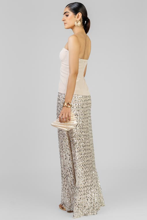 Vestido de fiesta de dos texturas con un corpiño tipo bustier de líneas limpias, con cierre por la espalda. La falda larga está confeccionada en un tjido plisado cubierto de lentejuelas que aportan brillo espectacular con cada movimeinto