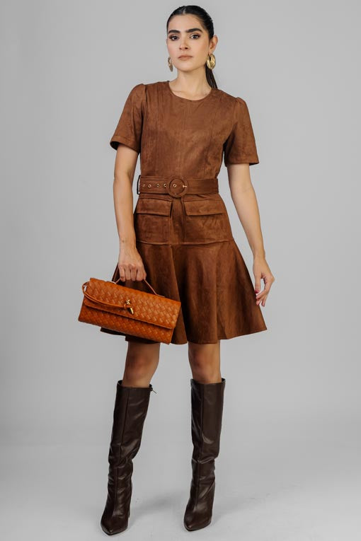 Vestido escote redondo, cierre por la espalda, manga corta, detalle de bolisllos al frente, corte bajo recto