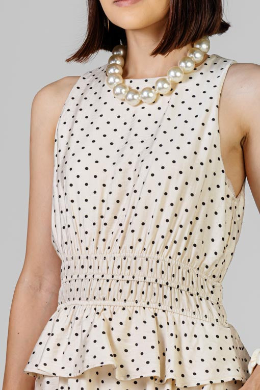 Vestido de silueta recta con caída suave y textura ligera. Diseño sin mangas con detalle fruncido en la cintua que define la figura sin apretar y falda fluida para máximo confort. El patrón de lunares le da un aire femenino y atemporal.