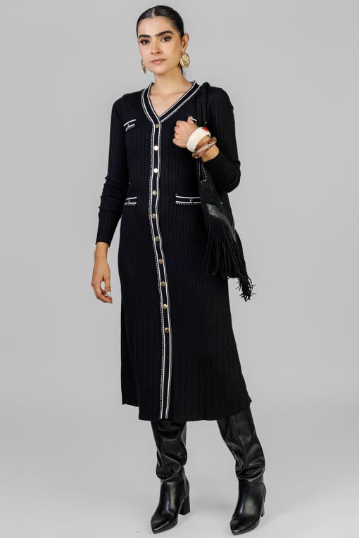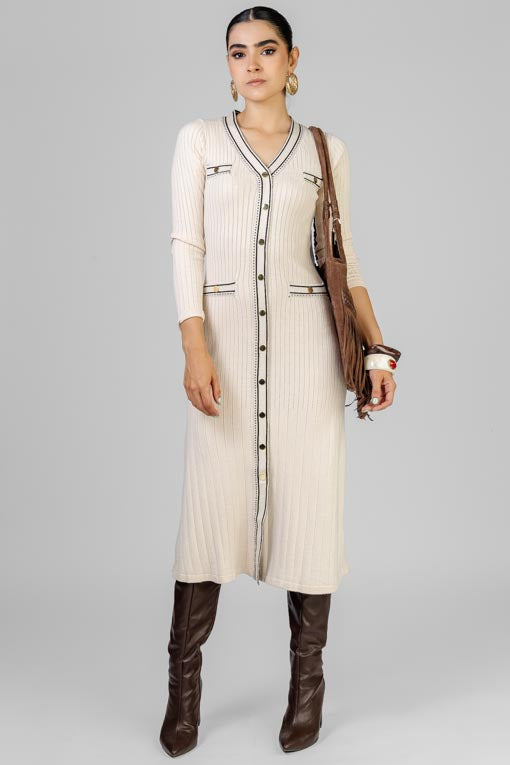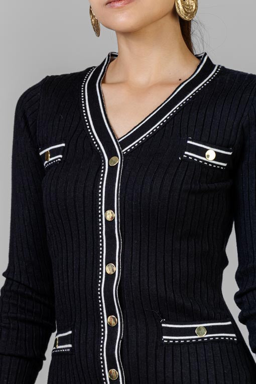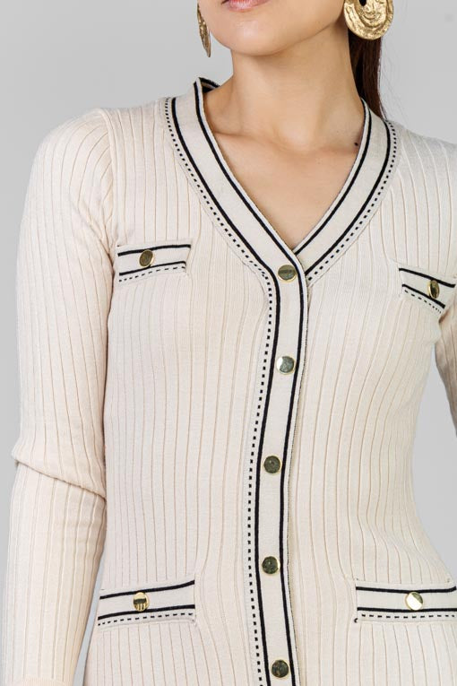 Vestido tejido ligero, escote en V, manga larga, detalle de botones decorativos al frente, corte bajo recto